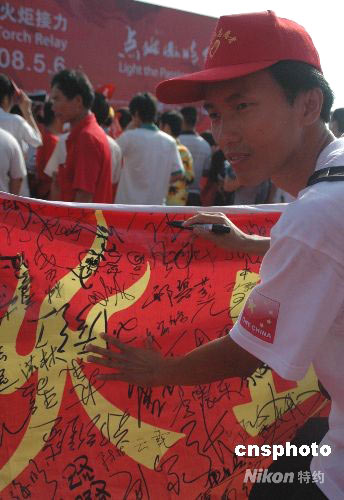 一名海口青年志愿者在支持奧運(yùn)的條幅上簽字。 中新社發(fā) 王辛莉 攝