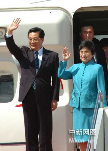 當?shù)貢r間5月6日下午1點45分左右,中國國家主席胡錦濤乘專機抵達日本羽田機場,開始對日本為期5天的國事訪問。圖為胡錦濤主席及夫人劉永清在機艙門口向歡迎人群揮手致意。中新社記者 朱沿華 攝