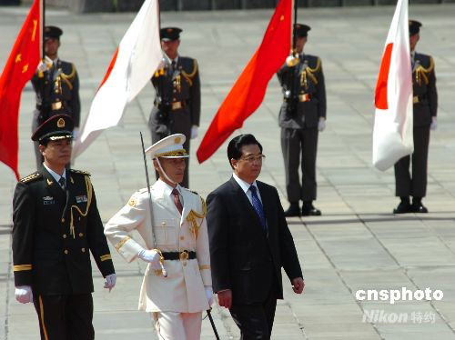 圖為胡錦濤在歡迎儀式上檢閱日本儀仗隊。中新社發(fā) 朱沿華 攝