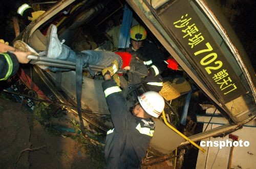 圖為消防人員將被困車內(nèi)的傷員救出。中新社發(fā) 郭晉嘉 攝