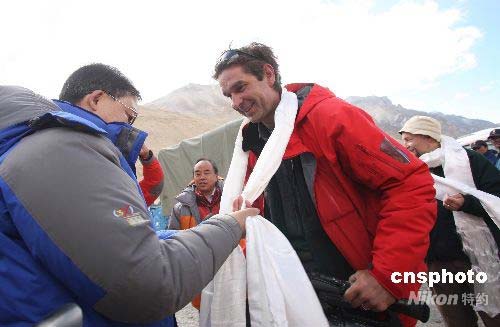 5月9日,在親眼目睹了奧運(yùn)圣火在珠峰傳遞的盛舉后,6家受邀的境外媒體的記者離開(kāi)珠峰大本營(yíng)絨布新聞中心,將奔赴北京。境外記者、北京奧組委的官員和工作人員、受邀的境內(nèi)記者和本次活動(dòng)的組織者道別,西藏自治區(qū)黨委宣傳部常務(wù)副部長(zhǎng)、珠峰新聞中心主任沈開(kāi)運(yùn)前來(lái)送行。圖為工作人員向境外記者獻(xiàn)上了潔白的哈達(dá)。中新社發(fā) 盛佳鵬 攝