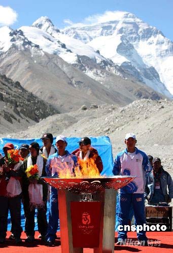 圖為在珠峰腳下熊熊燃燒的高原圣火臺(tái)。 中新社發(fā) 盛佳鵬 攝