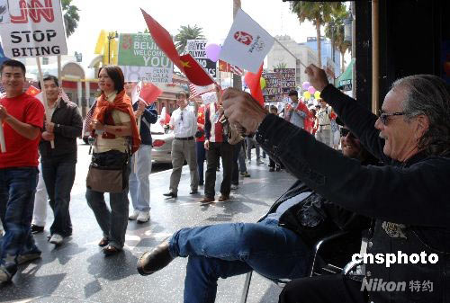 當(dāng)?shù)貢r間5月10日,通過網(wǎng)絡(luò)自發(fā)組織的南加州數(shù)百名華人華僑、留學(xué)生在洛杉磯著名的好萊塢星光大道上參加支持北京奧運集會游行活動。游行活動在歡歌笑語中進行,沿途受到一些洛杉磯市民的支持和響應(yīng)。 中新社發(fā) 張煒 攝