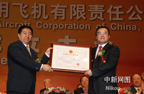 國(guó)家工商行政管理總局相關(guān)負(fù)責(zé)人向中國(guó)商用飛機(jī)有限責(zé)任公司董事長(zhǎng)張慶偉(右)頒發(fā)企業(yè)法人營(yíng)業(yè)執(zhí)照。