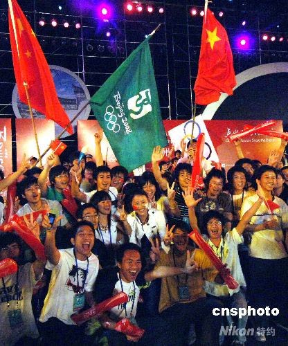 眾多福州青年在北京奧運(yùn)會(huì)火炬接力境內(nèi)傳遞福建福州站慶典儀式上,激情飛揚(yáng)歡慶奧運(yùn)圣火福州成功傳遞。中新社發(fā) 劉可耕 攝