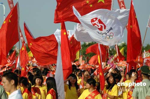 五月十二日上午,北京奧運火炬泉州站傳遞在中國閩臺緣博物館舉行。圖為圣火到來點燃泉州民眾的奧運熱情。中新社發(fā) 王東明 攝