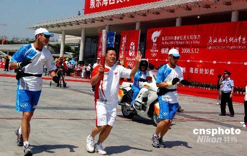 圖為首棒火炬手郭躍華起步傳遞。中新社發(fā) 傅丹丹 攝