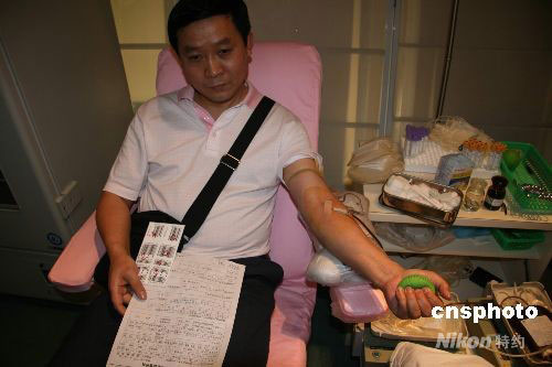 5月12日晚7時許至13日凌晨,數(shù)千成都市民前往市內(nèi)各獻(xiàn)血點(diǎn)獻(xiàn)血,為四川地震災(zāi)區(qū)的人們獻(xiàn)上愛心。圖為田先生在林蔭街武侯愛心獻(xiàn)血屋獻(xiàn)血。 中新社發(fā) 楊杰 攝
