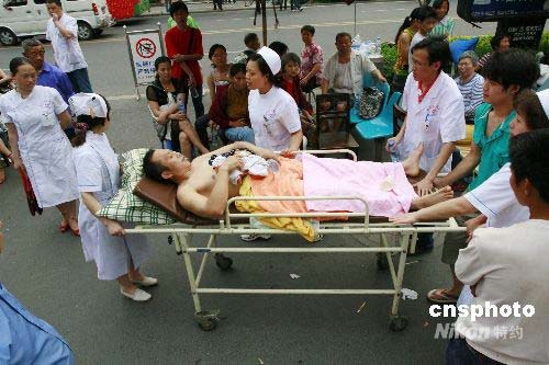5月12日,四川省遂寧市船山區(qū)人民醫(yī)院將病人疏散到安全地帶繼續(xù)治療。當(dāng)日14時(shí)28分,四川汶川發(fā)生7.8級地震,波及幾百公里之外的遂寧市,時(shí)間持續(xù)2分多鐘,造成當(dāng)?shù)夭糠址课莸顾。截止發(fā)稿之時(shí),人員傷亡情況正在統(tǒng)計(jì)之中。目前當(dāng)?shù)卣呀?jīng)啟動緊急預(yù)案,城市將人員疏散到安全地帶,群眾情緒穩(wěn)定,社會持續(xù)井然。中新社發(fā) 鐘 敏 攝