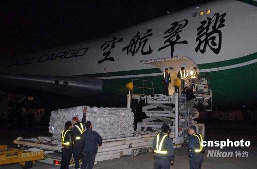 五月十三日深夜,深圳航空旗下的中德合資翡翠航空大型貨機JI7452受命緊急運輸救災(zāi)物資,四千頂帳篷從天津濱海機場連夜裝機起運,專機運往四川地震災(zāi)區(qū)。中新社發(fā) 陳文 攝