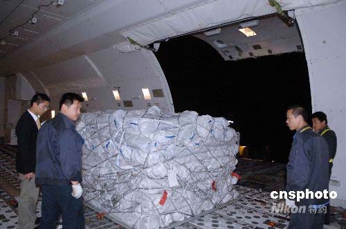 5月14日凌晨,深航旗下中德合資翡翠航空大型貨機(jī)JI7452航班滿載四千頂救災(zāi)帳篷,從天津?yàn)I海機(jī)場裝機(jī)運(yùn)往四川地震災(zāi)區(qū)。中新社發(fā) 陳文 攝
