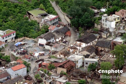 5月14日,空中拍攝的汶川縣城一角。成都軍區(qū)某陸航團四架直升機滿載帳篷、礦泉水等災(zāi)區(qū)急需物資抵達四川大地震震中汶川縣,并在返回時將第一批40名重傷員隨機送抵成都的醫(yī)院救治。中新社發(fā) 張雷 黃龍 攝