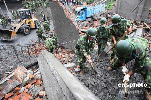 5月14日,在四川救災(zāi)的空降兵某部正在清理什邡市洛水鎮(zhèn)水泥廠廢墟。