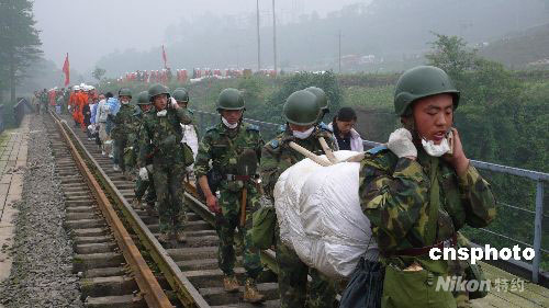 河南搶險(xiǎn)救援突擊隊(duì)負(fù)重步行進(jìn)入四川災(zāi)區(qū)