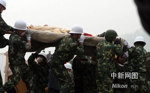 5月16日下午18時(shí)27分許,四川省德陽(yáng)市下轄的什邡市(縣級(jí)市)鎣華鎮(zhèn)鎣峰實(shí)業(yè)公司復(fù)合肥廠辦公樓廢墟中,一名被埋100小時(shí)的幸存者被消防官兵救出奇跡生還。該名幸存者,是51歲的男子,名叫劉德云在12日發(fā)生的地震中,該廠受到嚴(yán)重影響,廠房頃刻變?yōu)閺U墟。圖為消防官兵將幸存者用擔(dān)架抬出廢墟。 郭晉嘉 攝