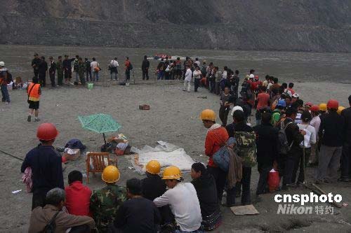 汶川縣映秀鎮(zhèn)等災(zāi)區(qū)群眾經(jīng)過(guò)幾天的跋涉,走到安全地帶等待運(yùn)往災(zāi)民安置點(diǎn)。中新社發(fā) 郭國(guó)權(quán) 攝