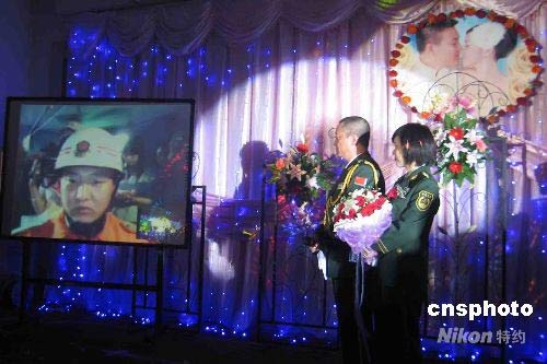 遼寧省遼陽市白塔消防大隊鐵西中隊副中隊長郎猛赴四川抗震救災(zāi),他與陜西省寶雞市扶風(fēng)消防大隊副指導(dǎo)員常芳的婚禮如期舉行。5月17日,新娘常芳在郎猛的家鄉(xiāng)遼寧省新民市舉行了一場特殊的婚禮。中新社發(fā) 沈殿成 攝