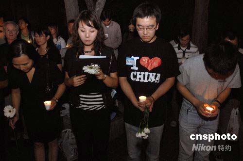 當(dāng)?shù)貢r(shí)間五月十六日晚,洛杉磯中國留學(xué)生和學(xué)者等兩百多人在加州大學(xué)洛杉磯分校舉行燭光追思會(huì),悼念四川大地震死難同胞,并向?yàn)?zāi)區(qū)捐獻(xiàn)愛心。中新社發(fā) 張煒 攝