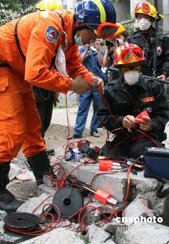 圖為救援隊(duì)在現(xiàn)場(chǎng)調(diào)試裝備。中新社發(fā) 齊彬 攝