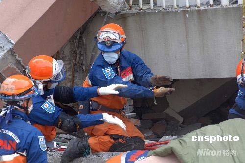 5月18日,日本國(guó)際救援隊(duì)一行二十余人到達(dá)中國(guó)四川北川地震現(xiàn)場(chǎng)——北川中學(xué),利用國(guó)際先進(jìn)的探測(cè)儀器與中國(guó)兩支救援隊(duì)分別挖掘廢墟,救援受難學(xué)生。經(jīng)過(guò)共同探測(cè),在沉入地下的樓層內(nèi)發(fā)現(xiàn)有三個(gè)生物體存在,但挖掘極為危險(xiǎn)和困難,生者生命渺茫。圖為日本小隊(duì)在工作中。中新社發(fā) 鄒憲 攝