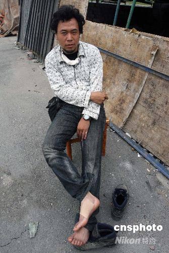 四川汶川大地震發(fā)生時(shí)在映秀鎮(zhèn)遭遇山體坍方而受重傷的《北京晚報(bào)》攝影記者甘南,堅(jiān)持在當(dāng)?shù)夭稍L到5月18日才在同事的陪伴下撤離。中新社發(fā) 任晨鳴 攝