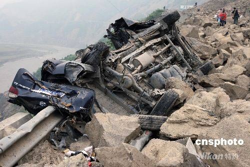 圖為甘南等人5月12日乘坐的汽車至今“擱淺”在被損毀的公路上。中新社發(fā) 任晨鳴 攝