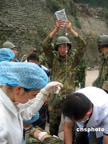 16日上午,師政治部主任高鵬帶領(lǐng)救援突擊隊(duì)和醫(yī)療小分隊(duì)172人,從綿竹市漢旺鎮(zhèn)出發(fā)向重災(zāi)區(qū)天池鄉(xiāng)幾個(gè)村里運(yùn)送救援物資,幫助群眾撤離震區(qū)。11時(shí)左右,當(dāng)部隊(duì)行至高橋以西500米處,突然發(fā)生余震,導(dǎo)致大量山石從山頂傾斜而下,直接威脅著正在這個(gè)路段通過(guò)的群眾。作訓(xùn)參謀祝紅杰突然發(fā)現(xiàn)一個(gè)孩子癱倒在石堆上,急忙上前搶抱他,孩子得救了,祝紅杰卻被亂石砸斷左腿,當(dāng)場(chǎng)倒地。作訓(xùn)參謀胡國(guó)才眼見(jiàn)一塊亂石砸向老人,極力將老人推到一邊,自己的頭部卻被亂石砸傷暈倒在地。同時(shí),該團(tuán)還有一名司務(wù)長(zhǎng)和兩名戰(zhàn)士在救援中被泥石流砸傷…… 看到解放軍為救災(zāi)區(qū)群眾身負(fù)重傷,在現(xiàn)場(chǎng)的一些救災(zāi)志愿者迅即投入搶救部隊(duì)官兵的行動(dòng)中。運(yùn)送途中山路險(xiǎn)峻,他們拉一把、推一把,爭(zhēng)先恐后出把力氣。擔(dān)負(fù)救援撤離群眾任務(wù)的重慶市高新區(qū)人民醫(yī)院的醫(yī)護(hù)人員聞?dòng)嵑螅贿吜髦鵁釡I,一邊實(shí)施現(xiàn)場(chǎng)救護(hù),為他們贏得了寶貴的救治時(shí)機(jī)……