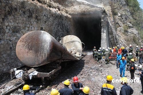 5月20日,寶成鐵路109號(hào)隧道搶險(xiǎn)工作取得重大進(jìn)展,隧道南口已拖出全部12節(jié)油罐車中的最后一節(jié)。截至當(dāng)日下午15時(shí),隧道南口已拖出14節(jié)受損車輛,其中包括全部12節(jié)油罐車,隧道北口拖出8節(jié)車輛。至此,109號(hào)隧道內(nèi)僅剩下18輛車未拖出。中新社發(fā) 唐振江 攝