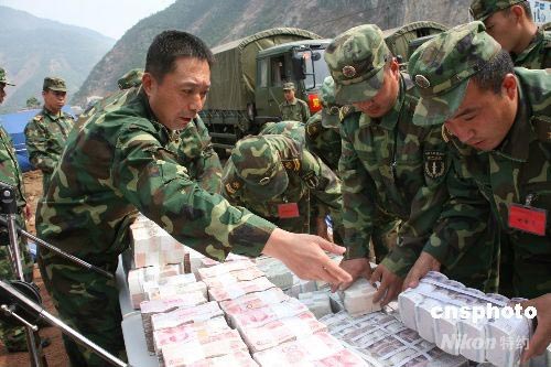 5月22日,第二炮兵某技術(shù)總隊政委高海華將620多萬元人民幣金庫庫款、重要資料等清單移交給了綿陽市農(nóng)村信用聯(lián)社負責(zé)人陳利雄。四川省北川縣信用聯(lián)社八層大樓,是北川縣損壞最嚴重的建筑之一,里面不但埋有多名工作人員,而且還有存放大量資金的國家金庫。5月15日上午,第二炮兵某技術(shù)總隊接到任務(wù)后,立即組織了由86名專業(yè)技術(shù)骨干組成的搜救隊,攜帶挖掘機、切割機、生命探測儀等設(shè)備火速趕往該聯(lián)社進行被埋人員和金庫庫款的搶救。共營救出9名幸存者,并于21日晚成功搶救出金庫庫款620多萬元和大量寶貴資料。圖為救援人員認真清點現(xiàn)金。中新社發(fā) 陳雙維 攝
