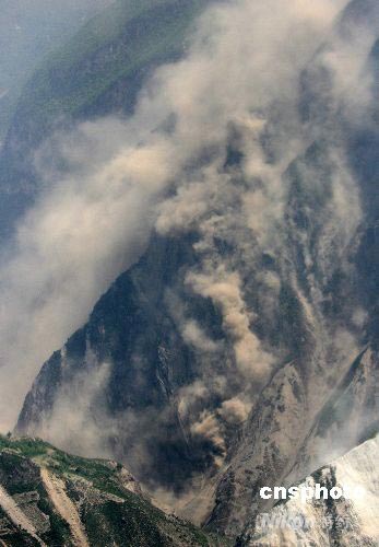 五月二十三日是汶川大地震第十二天,震中區(qū)的高山上依然不斷發(fā)生山體滑坡,泥石滾滾,煙霧騰騰。中新社發(fā) 賈國榮 攝