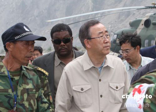 聯(lián)合國(guó)秘書長(zhǎng)潘基文在映秀鎮(zhèn)察看地震災(zāi)情