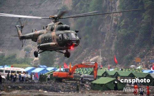 5月21日,運(yùn)滿(mǎn)傷員的軍用直升機(jī)降落在映秀臨時(shí)救助點(diǎn)。中新社發(fā) 曾憲平 攝