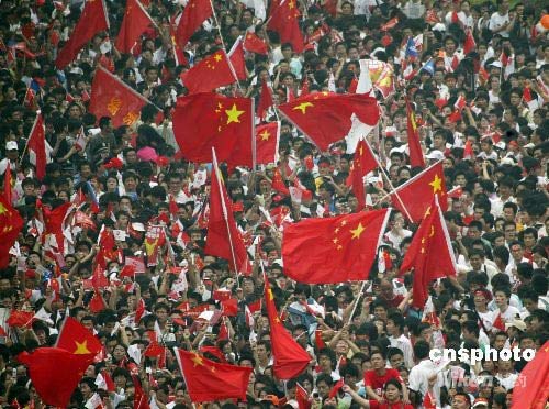 圖:熱情群眾揮舞國旗歡迎祥云火炬