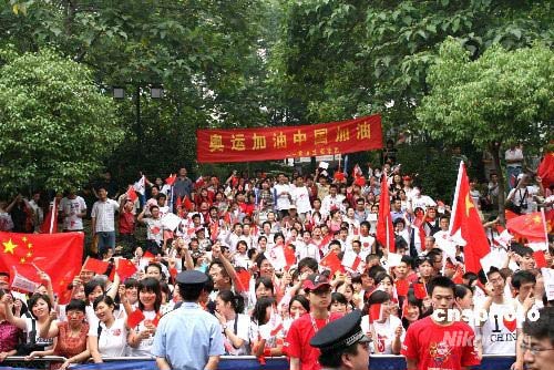 圖為在悶熱天氣中,熱情歡迎奧運火炬?zhèn)鬟f的群眾。中新社發(fā) 崔佳明 攝