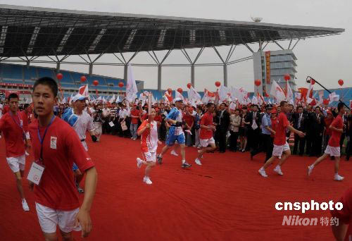 5月28日,奧運(yùn)圣火在安徽合肥傳遞,合肥籍武術(shù)項(xiàng)目世界冠軍范雪平在合肥體育場(chǎng)傳遞最后一棒火炬,隨后點(diǎn)燃圣火盆。中新社發(fā) 廖攀 攝