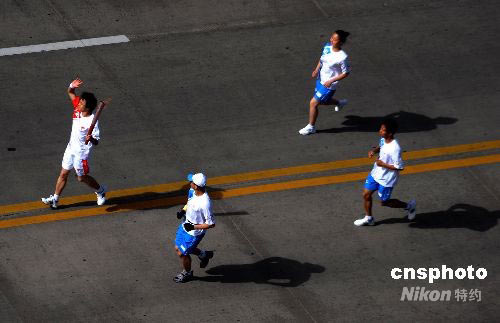 圖為第57號(hào)火炬手在傳遞火炬。中新社發(fā) 廖攀 攝