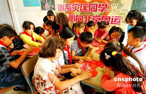 5月29日上午,浙江義烏群星學(xué)校舉行“心系災(zāi)區(qū)學(xué)生 心向北京奧運(yùn)” 慶“六一” 活動(dòng)。全校2300多名學(xué)生與147名外籍學(xué)生,在各自的心愿卡上寫下祝福話語,祝愿四川地震災(zāi)區(qū)小朋友“六一”快樂,祝愿北京奧運(yùn)會圓滿成功。中新社發(fā) 張建成 攝