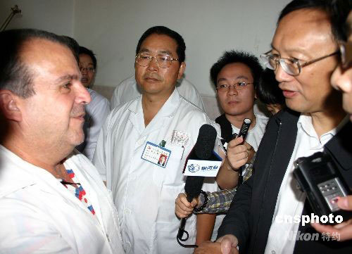 5月30日上午,中國(guó)外交部部長(zhǎng)楊潔篪來(lái)到四川省人民醫(yī)院,看望在這里救治地震災(zāi)區(qū)傷病員的古巴醫(yī)療隊(duì),感謝他們給予四川地震災(zāi)區(qū)民眾的關(guān)心,并高度贊揚(yáng)了他們的國(guó)際人道主義精神。中新社發(fā) 楊杰 攝