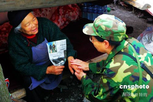 廣州軍區(qū)武漢總醫(yī)院心理專家為帳篷內(nèi)一老人撫手做心理輔導(dǎo)。中新社發(fā) 徐維鴻 攝