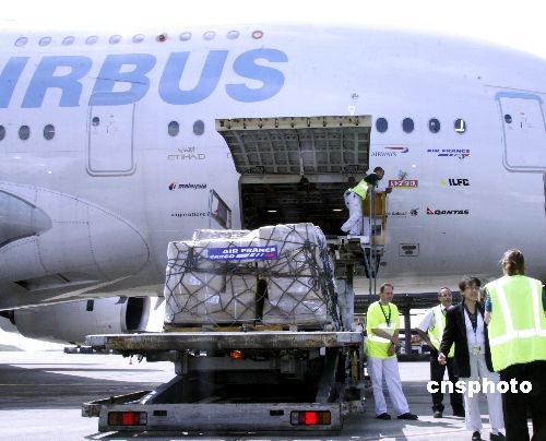 巴黎時(shí)間5月30日下午,由中國駐法國大使館組織的第二批救災(zāi)帳篷從巴黎戴高樂機(jī)場啟運(yùn)四川地震災(zāi)區(qū),這批帳篷共1105頂,價(jià)值25萬多歐元。帳篷的募集得到了法國僑界、法國企業(yè)界的大力支持,由空客提供巨無霸A380飛機(jī)運(yùn)送。另外,中國駐法使館和僑界組織的第三批救災(zāi)帳篷1000頂將于30日夜里啟運(yùn)四川。中新社發(fā) 吳衛(wèi)中 攝