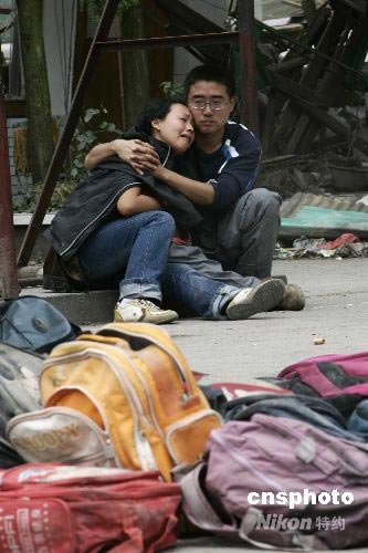 5月30日,四川什邡市紅白鎮(zhèn)中心小學(xué)的家長在操場上認(rèn)領(lǐng)遇難孩子的書包,找到書包的父母在一旁傷心欲絕。5.12地震該校教學(xué)樓全部倒塌,大部分學(xué)生遇難。中新社發(fā) 杜洋 攝