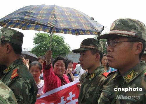 老大娘為參加唐家山堰塞湖搶險(xiǎn)的武警官兵打傘