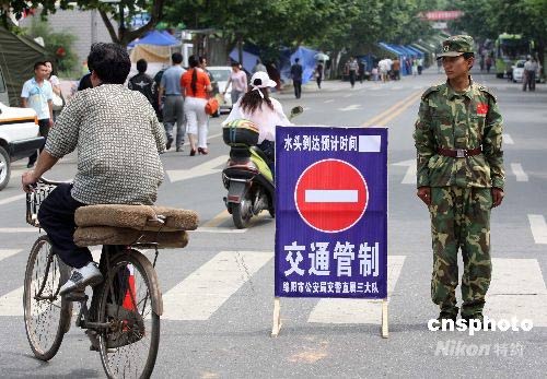 5月31日,唐家山堰塞湖避險疏散預(yù)案三分之一潰壩方案涉及的下游群眾,已全部撤離到安全地帶。圖為安置疏散民眾的綿陽市游仙區(qū)綿山路實行交通管制。中新社發(fā) 毛建軍 攝