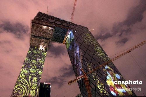 拳擊運(yùn)動員鄒市明巨幅畫像投影在尚未竣工的央視新大樓樓體上。中新社發(fā) 楊可佳 攝
