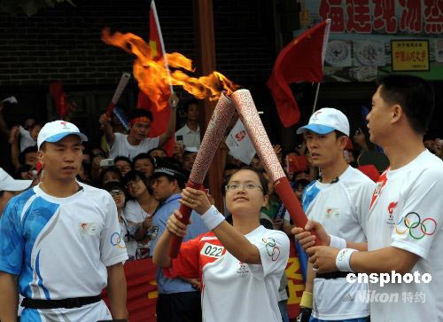 圖為22號(hào)火炬手點(diǎn)燃“祥云”火炬。中新社發(fā) 廖攀 攝
