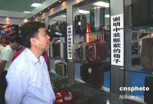六月三日,海口開幕的2008海南反腐倡廉警示教育展覽,展出原海南省委委員、文昌市委書記謝明中裝贓款的十八只箱子,以及價值四十萬元人民幣的滿天星手表等贓物。謝明中在擔任文昌市委書記期間,利用職權,在工程審批、資金安排、干部提拔等方面為他人謀取利益,大量收受或索取賄賂,還與多名女性發(fā)生不正當男女關系。海南省紀委共查獲謝明中轉移或藏匿的賬款折合人民幣兩千五百余萬元,另有金銀首飾等物品十七件。中新社發(fā) 關向東 攝
