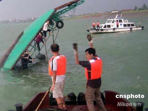 2008年6月4日,據(jù)湖北枝江市海事局(處)消息,6月3日18時20分,長江中游干線湖北枝江段突發(fā)強風(fēng)暴并伴暴雨冰雹,造成在枝江市五碼頭附近水域的一條客渡船和一條漁船翻沉,16人落水,9人獲救,7人失蹤。另據(jù)枝江市政府稱,此次強風(fēng)暴造成枝江市馬家店、百里洲、仙女、董市4個鄉(xiāng)鎮(zhèn)電力中斷,江面風(fēng)力達(dá)10級,20分鐘左右降雨達(dá)37毫米,冰雹最大直徑9毫米;枝江城區(qū)部分電線桿被刮倒,枝江全城停電。目前,枝江海事部門仍在全力搜救失蹤人員。中新社發(fā) 劉君鳳 攝
