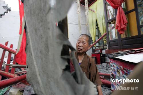 6月4日,四川綿竹漢旺鎮(zhèn)云霧寺的尼姑,回到被地震毀壞的寺廟,看到滿目瘡痍的景象頗為無奈。中新社發(fā) 慎重 攝