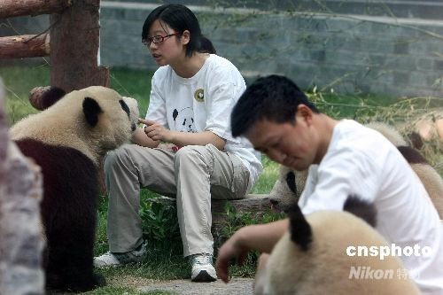 6月5日上午,八只臥龍“奧運(yùn)大熊貓寶寶”在北京動(dòng)物園的新家中首次公開亮相。這些1歲多的“小國(guó)寶”不時(shí)需要臥龍來(lái)的飼養(yǎng)員用四川鄉(xiāng)音安撫它們?cè)?·12大地震中受到驚嚇的心靈。 中新社發(fā) 任晨鳴 攝