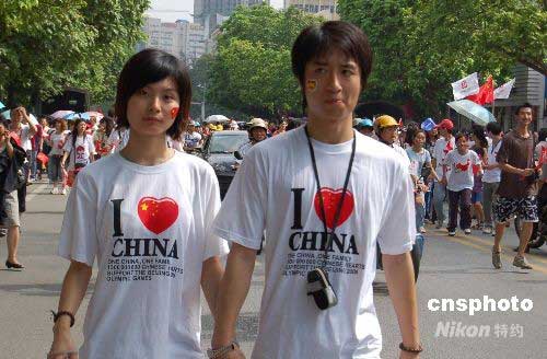 一對(duì)年輕情侶牽手街頭迎接奧運(yùn)圣火。中新社發(fā) 劉萬(wàn)強(qiáng) 攝